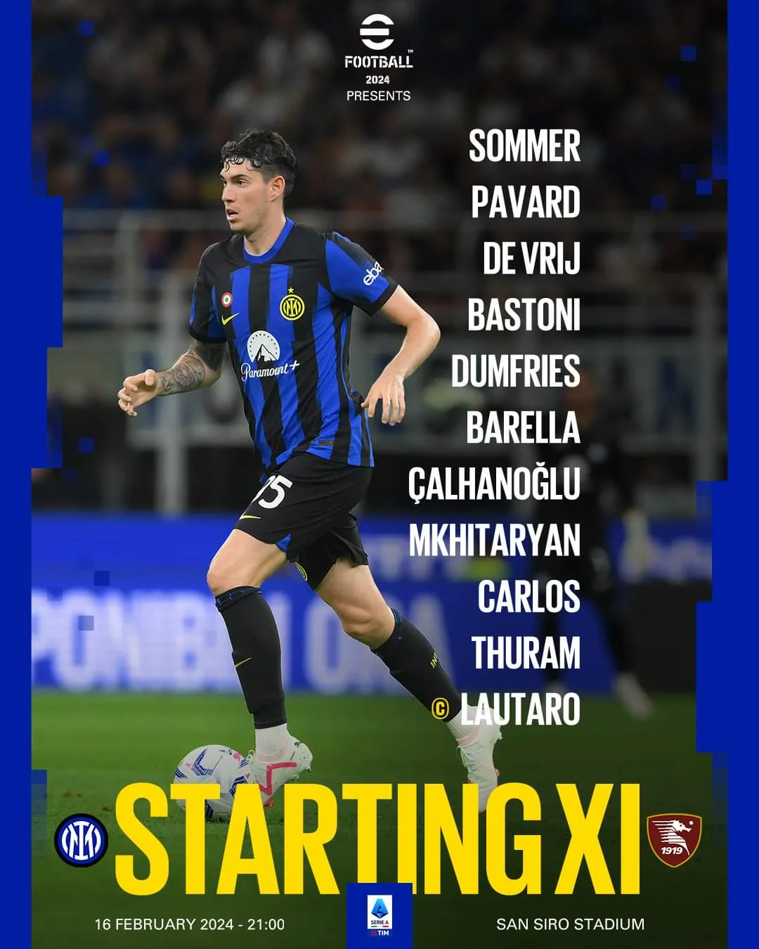 أعلن الإيطالي سيموني إنزاجي، المدير الفني لإنتر ميلان، تشكيلة فريقه لمواجهة ساليرنتانا، في الجولة الخامسة والعشرين من الدوري الإيطالي.