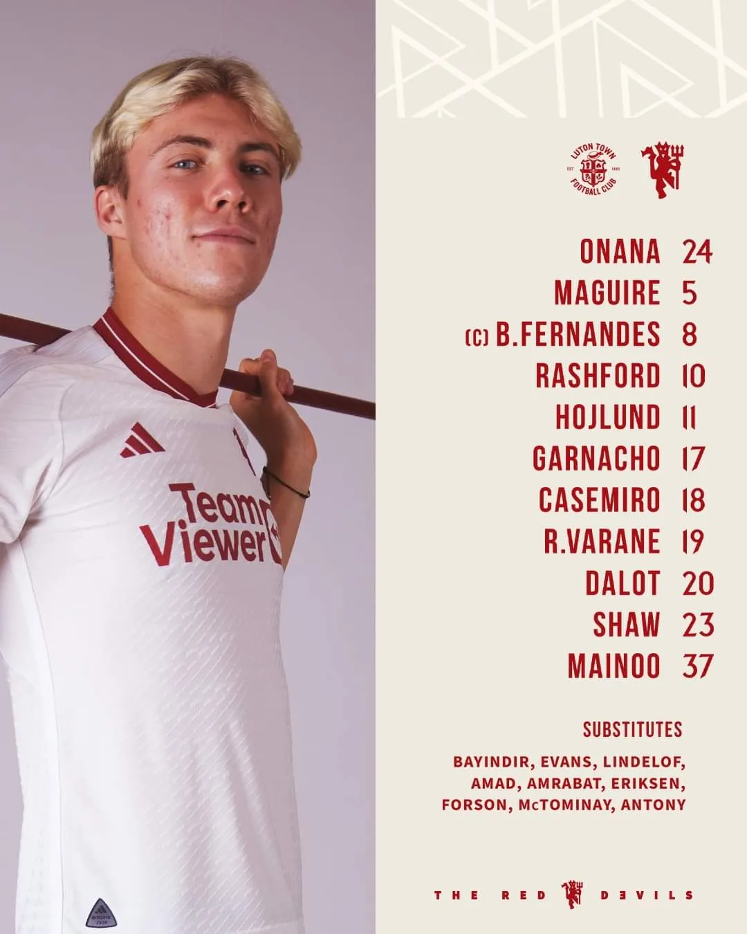 أعلن الهولندي إيريك تين هاج، تشكيلة مانشستر يونايتد التي ستواجه لوتون تاون، لحساب الجولة 25 من الدوري الإنكليزي الممتاز، مساء اليوم الأحد.
