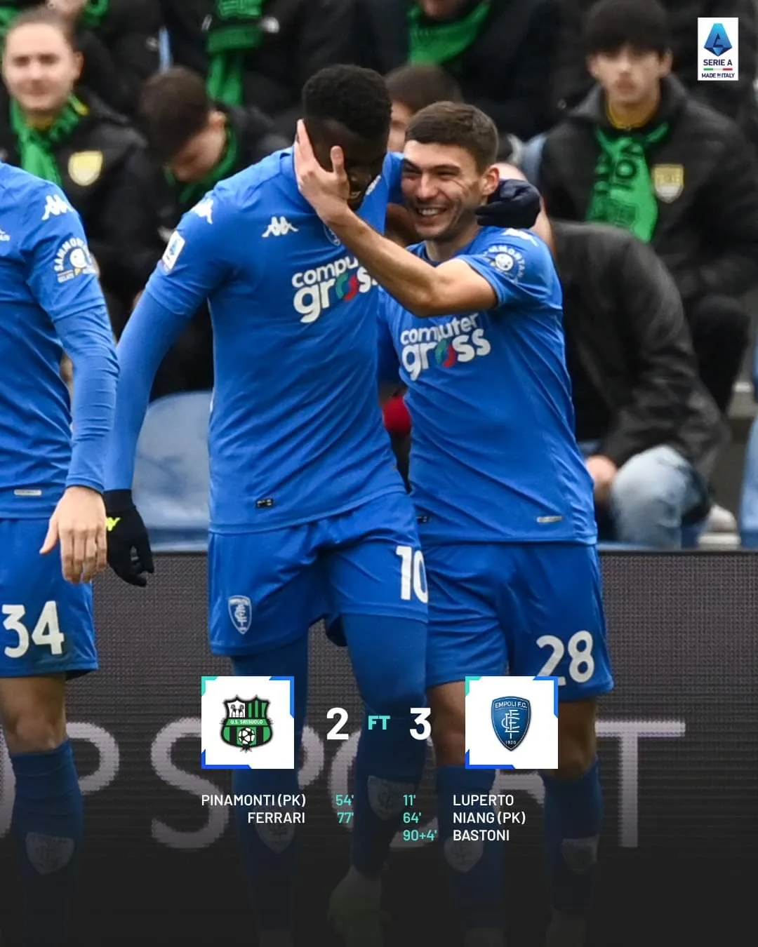 حقق إيمبولي فوزاً متأخراً من مضيفه ساسوولو، بثلاثة أهداف لهدفين، ضمن الجولة السادسة والعشرين من الدوري الإيطالي.