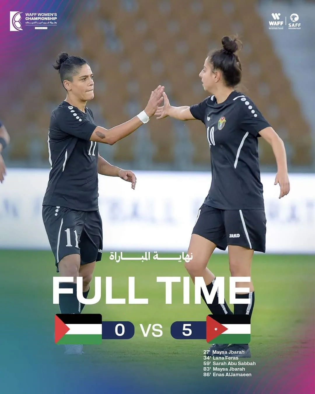 تأهل المنتخب الأردني للسيدات، إلى نهائي بطولة غرب آسيا، المقامة في السعودية، باكتساحه منتخب فلسطين بخماسية نظيفة.