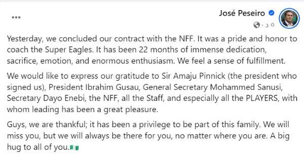ونشر بيسيرو، عبر حسابه الشخصي على منصة “إكس”: “إنه من دواعي سعادتي، قيادة النسور على مدار 22 شهراً من التفاني والتضحية والحماس الهائل”.