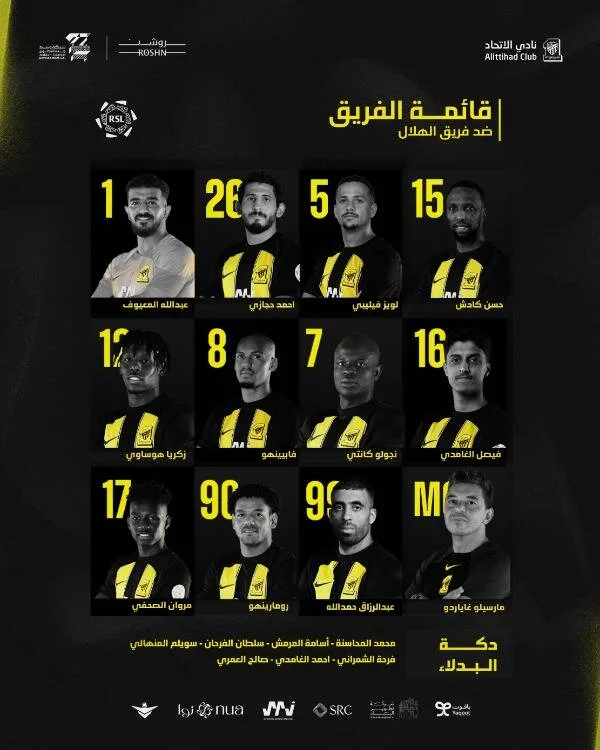 خط الوسط: زكريا هوساوي، فابينيو، نجولو كانتي، فيصل الغامدي، مروان الصحفي