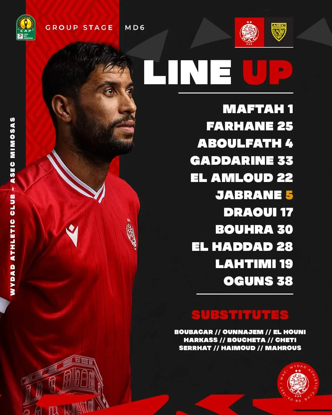 أعلن المدرب التونسي فوزي البنزرتي، تشكيلة فريقه الوداد، حيث يواجه أسيسك ميموزا الإيفواري، في ختام مباريات دور المجموعات من دوري أبطال أفريقيا.