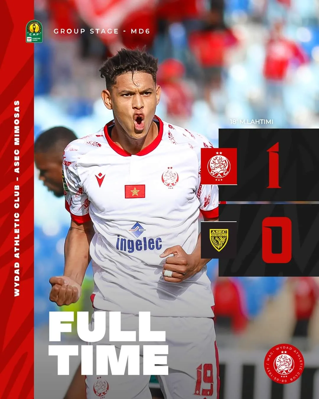 غادر الوداد المغربي، منافسات دوري أبطال أفريقيا من دور المجموعات، رغم فوزه على أسيك ميموزا الإيفواري، بهدف دون رد.