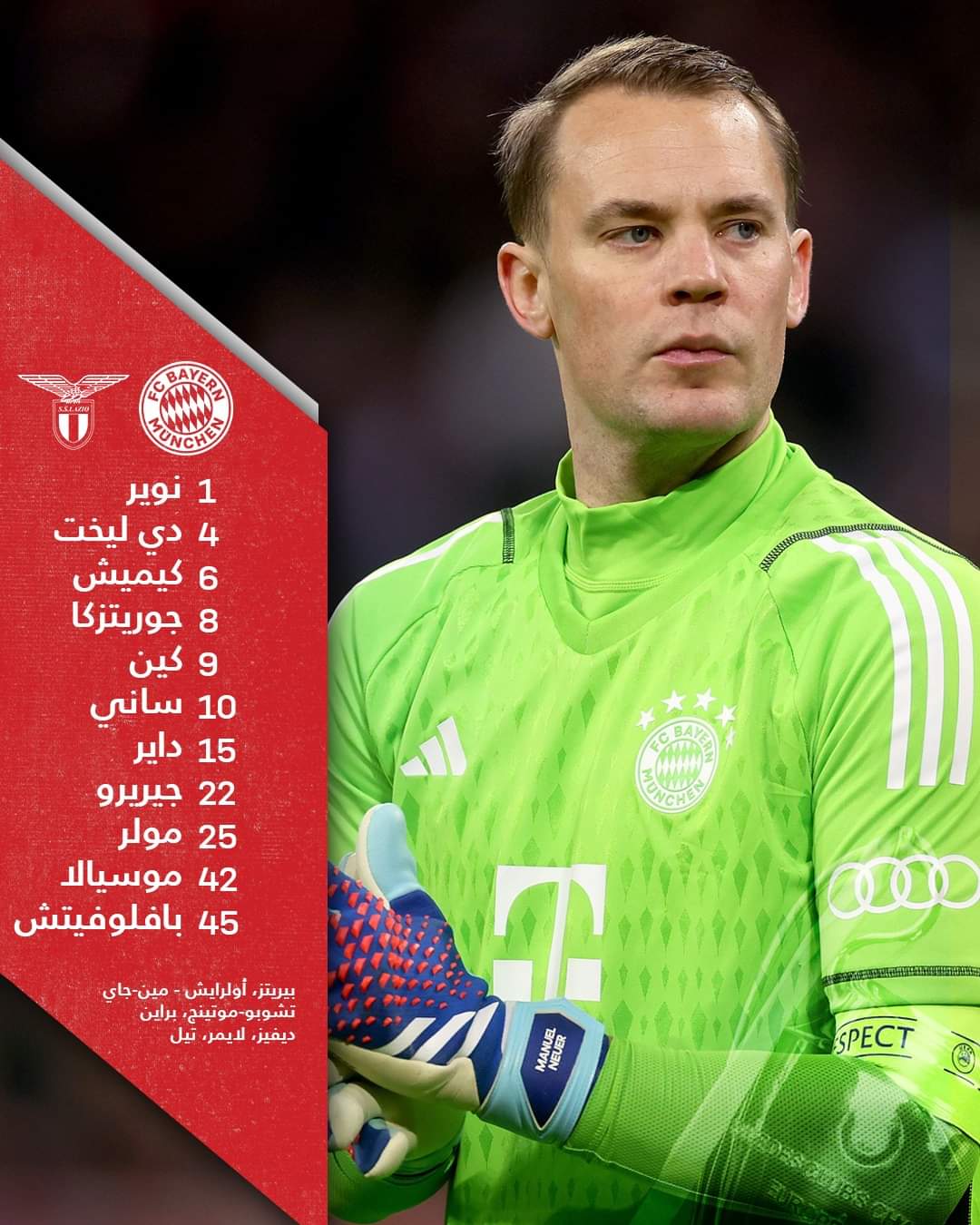 نوير- دي ليخت- كيميتش- جوريتسكا- كين- ساني- داير- جيريرو- مولر- موسيالا- بافلوفيتش.