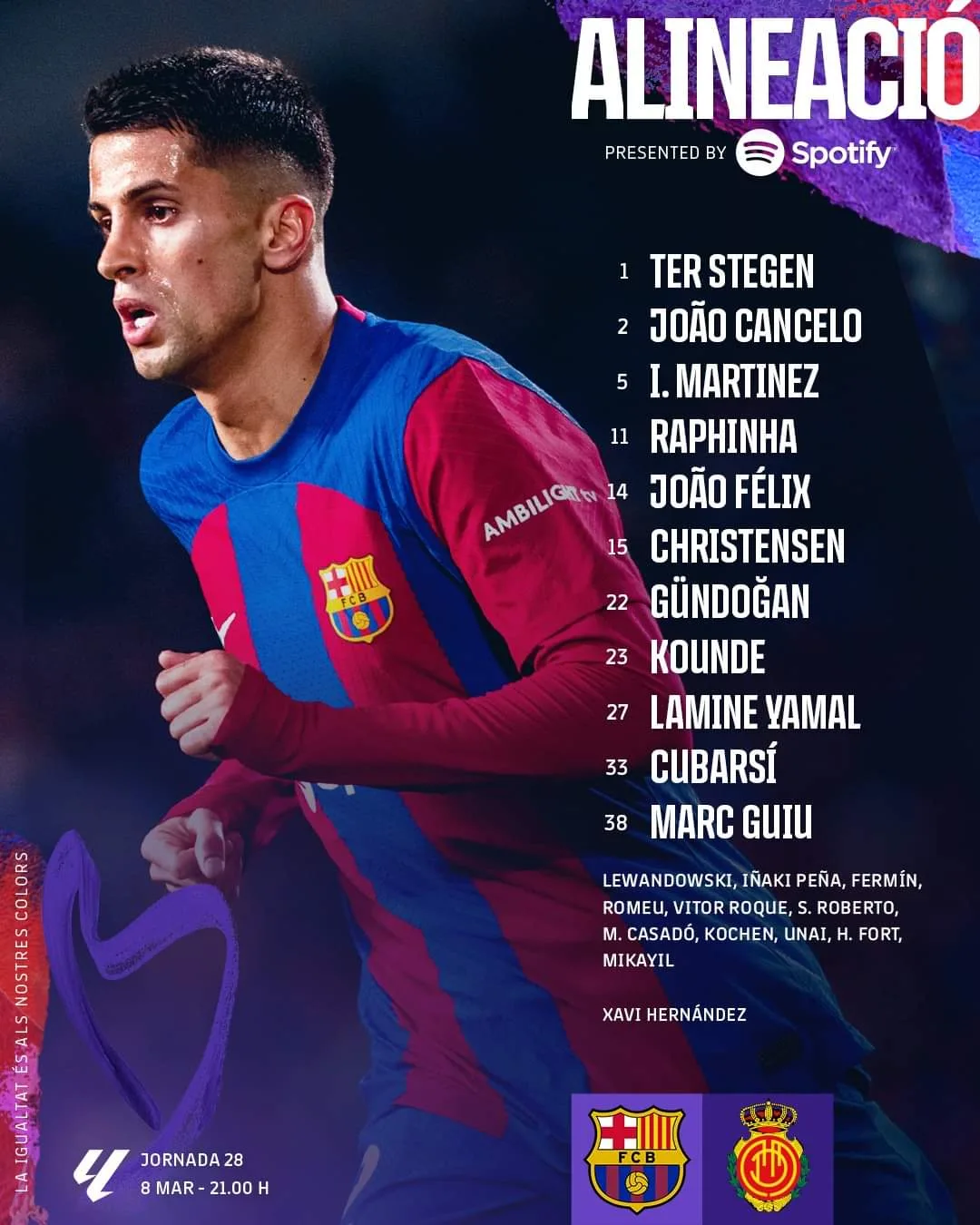 اعتمد تشافي هيرنانديز، المدير الفني لبرشلونة، تشكيلة فريقه لمواجهة ريال مايوركا، في افتتاح منافسات الجولة 28 من الدوري الإسباني.