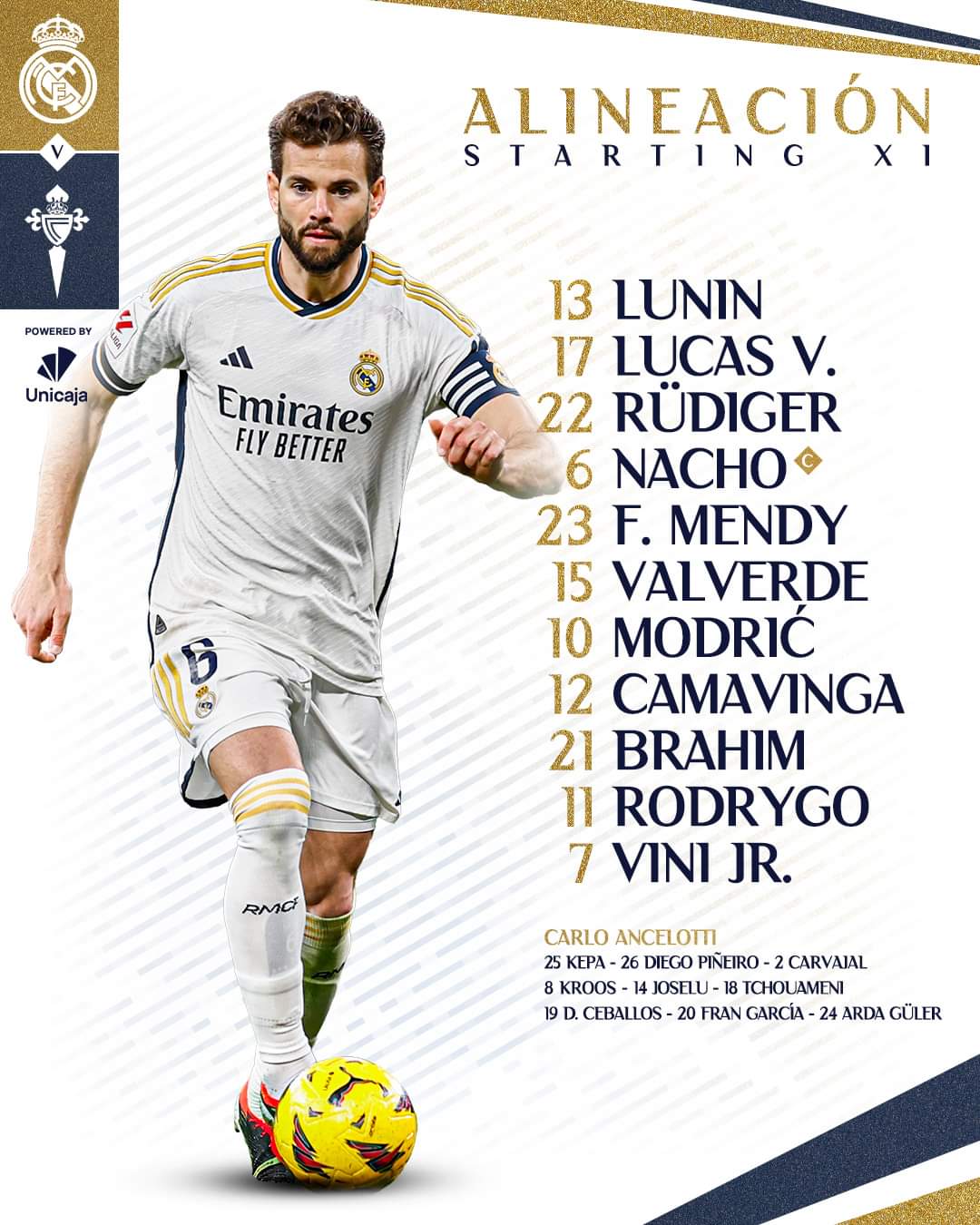 أعلن الإيطالي كارلو أنشيلوتي، مدرب ريال مدريد، تشكيلة الميرنجي لمواجهة سيلتا فيجو اليوم، في الجولة 28 من الليجا.