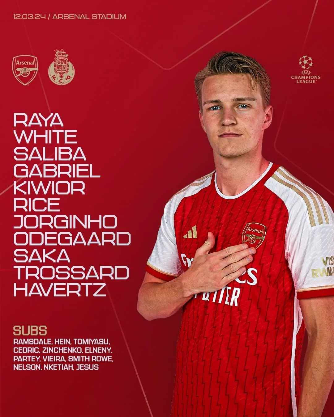 أعلن الإسباني ميكيل أرتيتا، المدير الفني لآرسنال، تشكيل فريقه لمواجهة بورتو، مساء اليوم، في إياب دور الـ16 لدوري أبطال أوروبا.
