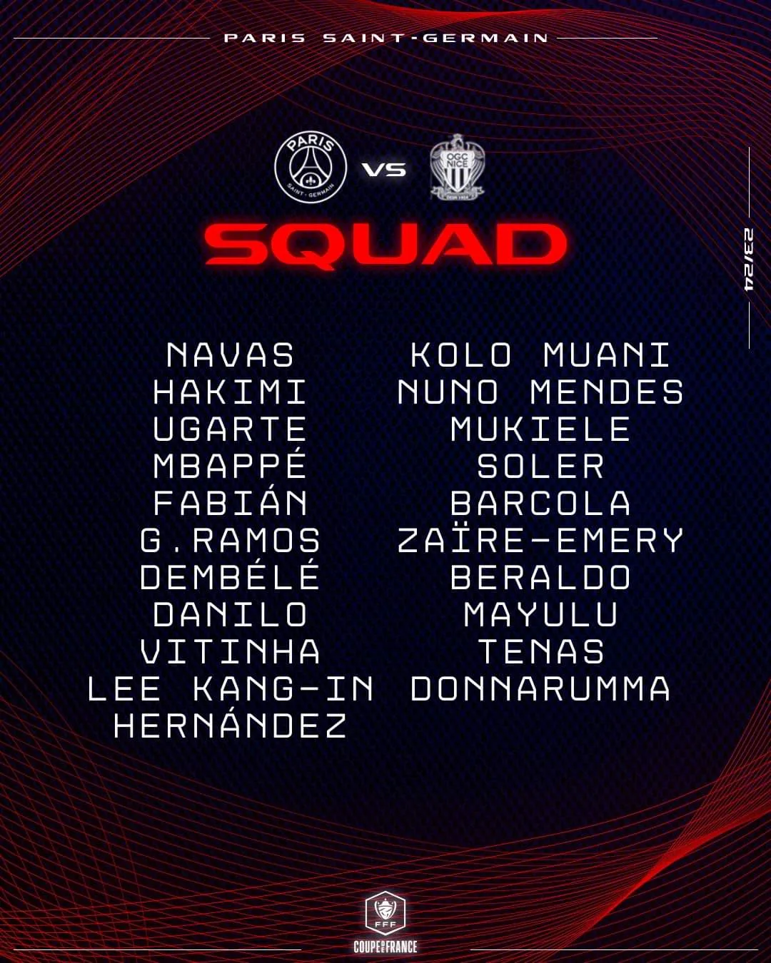 كيلور نافاس، حكيمي، أوجارتي، مبابي، فابيان رويز، جونسالو راموس، عثمان ديمبلي، دانيلو، فيتينيا، لي كانج، لوكاس هرنانديز، كولو مواني، نونو مينديس، موكيلي، سولير، باركولا، زاير إيمري، بيرالدو، مايولو، تيناس، ودوناروما.