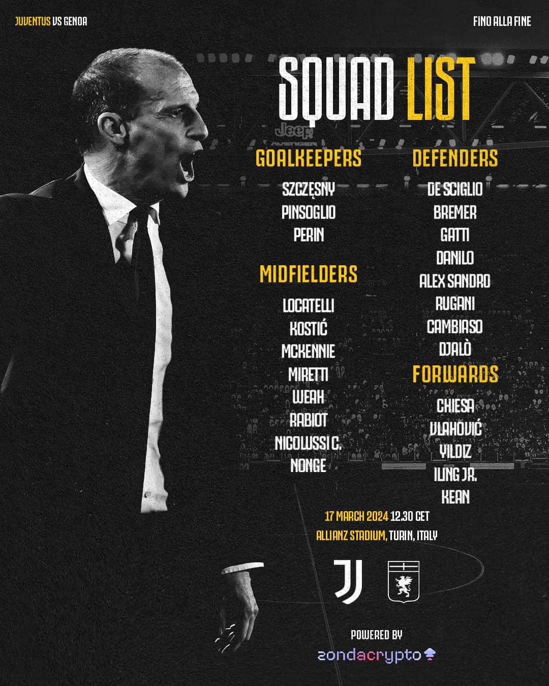 كشف الإيطالي ماسيمليانو أليجري، المدير الفني ليوفينتوس، قائمة البيانكونيري لمواجهة جنوى، في أليانز ستاديوم، يوم غد الأحد، ضمن الجولة 29 من الكالتشيو.