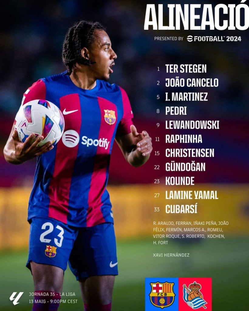 أعلن تشافي هيرنانديز، مدرب برشلونة، تشكيلة النادي الكاتالوني لمواجهة ضيفه ريال سوسييداد، لحساب الجولة 35 من الدوري الإسباني.