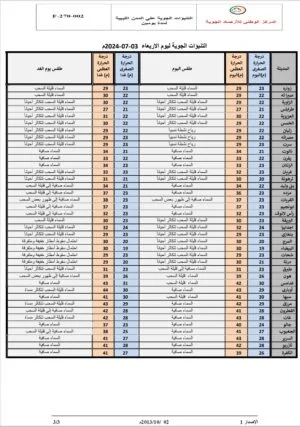 وأفاد المركز في نشرته عن الأحوال الجوية اليوم الأربعاء، أن درجات الحرارة القصوى تراوح بين 27 و43 درجة مئوية في جميع المناطق.