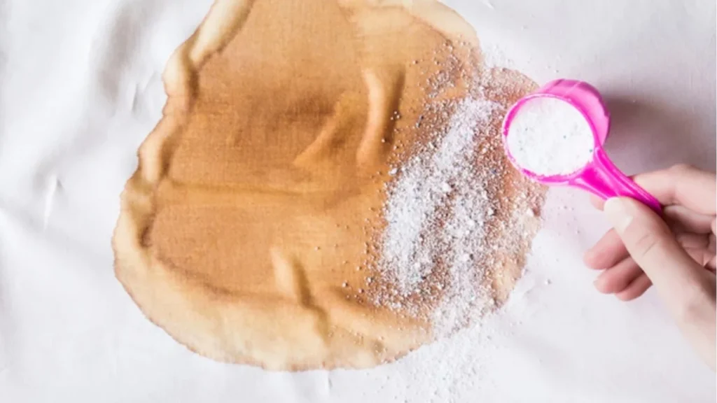ضعي القليل من بيكربونات الصودا على البقعة وافركي المنطقة برفق قبل الغسيل، حيث ستساعد بيكربونات الصودا على امتصاص البقعة.