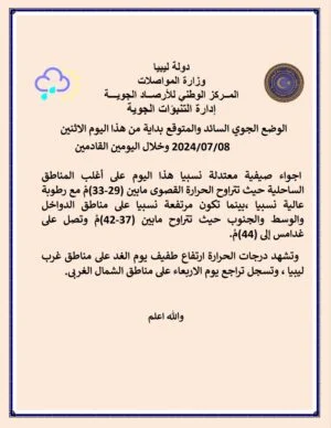 درجات الحرارة القصوى: تتراوح ما بين 31–34مْ على المناطق الساحلية مع رطوبة عالية نسبيا، وما بين 37-41مْ على الدواخل وتسجل ارتفاعا طفيفا يوم الغد.