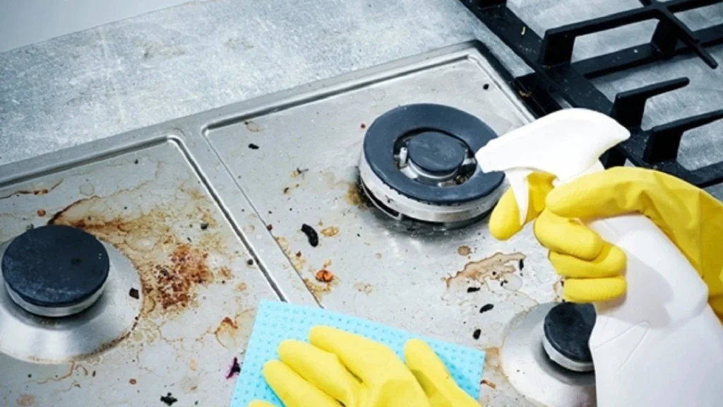 4. أزيلي بقايا آثار الحروق باستخدام الأداة الكاشطة الخاصة بالموقد، ومحلول إزالة الشحوم، وتجنبي استخدام السكين أو الشفرة نهائياً.