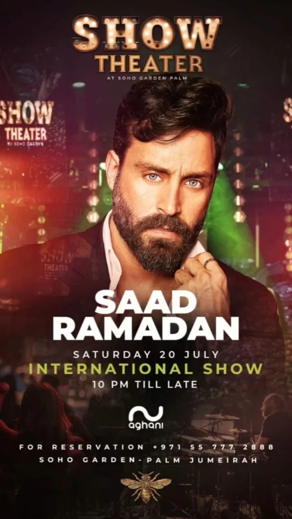 سيحيي النجم اللبناني سعد رمضان حفلاً غنائياً كبيراً يوم 20 يوليو في مسرح “شو ثياتر” SHOW THEATER BY SOHO GARDEN. ومن المتوقع أن يقدم رمضان خلال الحفل باقة من أجمل أغانيه المحبوبة، بحضور جماهيري مميز وكبير. يعد هذا الحفل من أبرز الفعاليات الموسيقية في دبي هذا الصيف ، حيث يتطلع عشاق الفنان اللبناني إلى قضاء ليلة موسيقية رائعة مليئة بالألحان الجميلة والأجواء الاحتفالية.