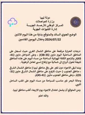الرياح: متغيرة الاتجاه خفيفة السرعة تتحول تدرجيا من بعد ظهر اليوم إلى شمالية فشمالية غربية معتدلة إلى نشطة السرعة على أقصى الساحل الغربي حتى طرابلس وتشمل باقي المناطق فترة المساء اليوم.
