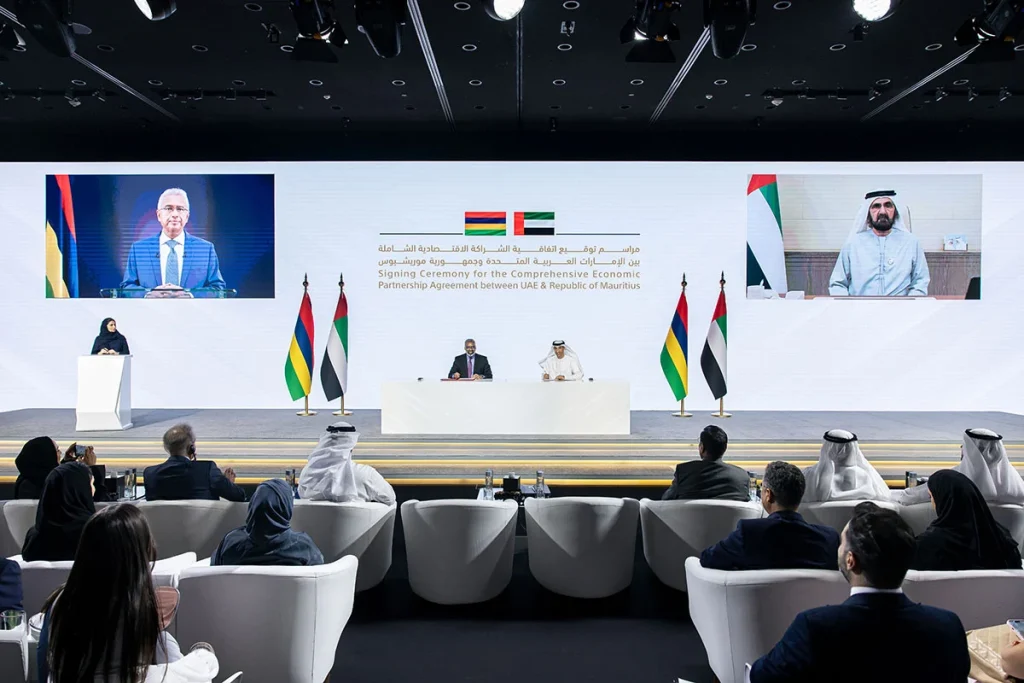 وتعد هذه الاتفاقية الأولى من نوعها التي تبرمها الإمارات مع دولة أفريقية، وتستهدف هذه الشراكة الواعدة المساهمة في زيادة الناتج المحلي الإجمالي لدولة الإمارات بنسبة 0.96 بالمئة بحلول عام 2030، وإضافة 1 بالمئة إلى الناتج المحلي الإجمالي لموريشيوس في الفترة ذاتها.