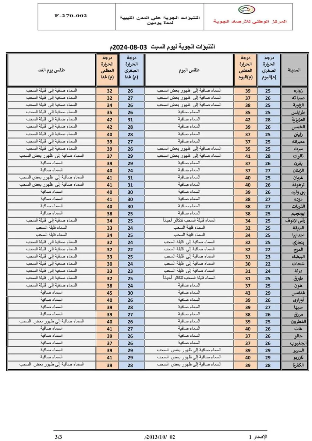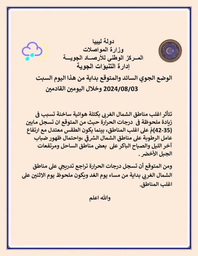 وأفاد المركز في بيان له منذ قليل، أنه من المتوقع أن تسجل مــا بين (38-41)مْ وعلى المناطق الساحلية مابين (29-35)مْ مع ارتفاع عامل الرطوبة على مناطق الشمال الشرقي واحتمال ظهور ضباب آخر الليل والصباح الباكر على مرتفعات الجبل الأخضر .