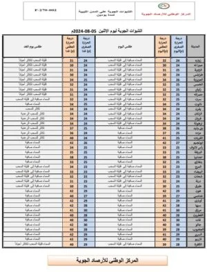 درجات الحرارة القصوى: تتراوح على اغلب المناطق ما بين 31-33مْ.