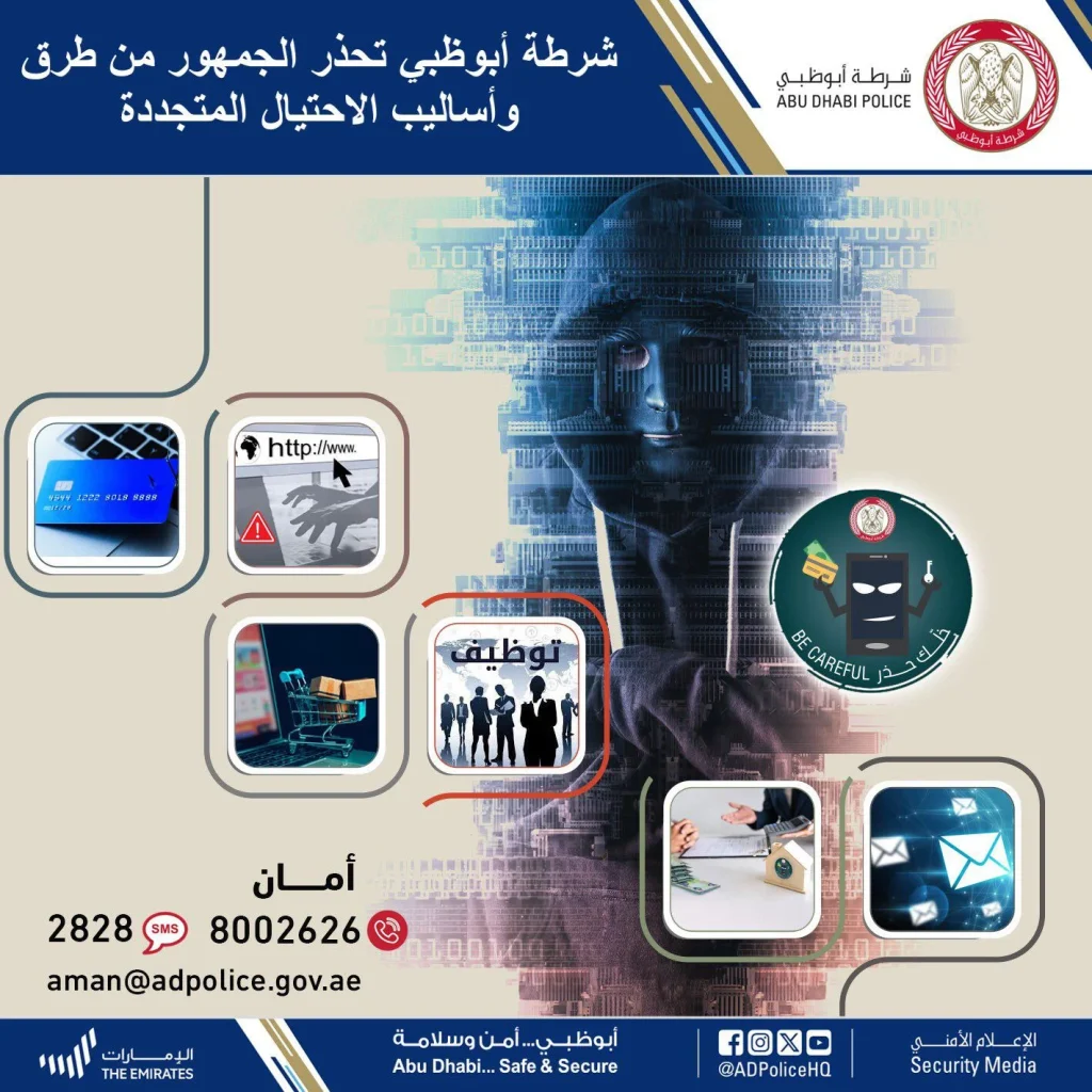 ودعت شرطة أبوظبي الجمهور في حالة النصب التوجه الى أقرب مركز شرطة وسرعة الإبلاغ عن أي اتصالات تردهم من قبل مجهولين يطالبونهم بتحديث بياناتهم المصرفية، بالتواصل مع خدمة أمان رقم 8002626 أو عن طريق ارسال رسالة نصية 2828 او البريد الإلكتروني aman@adpolice.gov.ae تعزيزاً لجهود الشرطة في مواجهة هذه الأساليب الاحتيالية ووقاية المجتمع من مخاطرها.