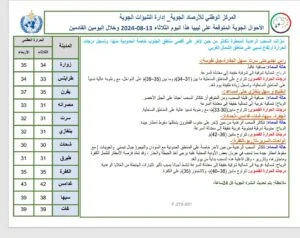 درجات الحرارة القصوى: تتراوح على المناطق الساحلية ما بين 31–34مْ وما بين 35–38مْ على الدواخل، مع رطوبة عالية نسبياً على المناطق الساحلية، وتسجل زيادة طفيفة يوم الغد.