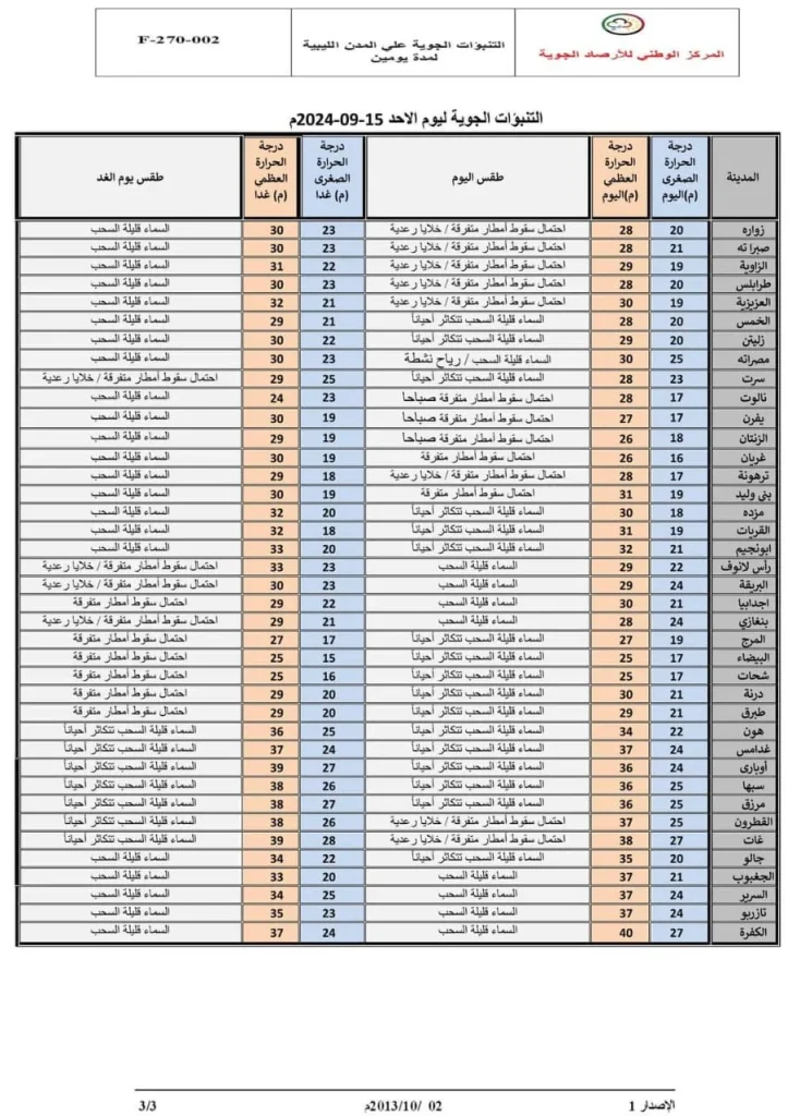 أفاد المركز الوطني للأرصاد الجوية، بسقوط أمطار رعدية مساء اليوم الأحد 15 سبتمبر 2024 على بعض مناطق الجنوب الغربي متوقع أن تكون جيدة إلى غزيرة خاصة على ( القطرون – الويغ – تيجرهي – غات – البركت – سلسلة جبال اكاكوس) مما تؤدى جريان الأودية وحدوث سيول خاصة من الداخل الجزائري (جانيت)باتجاه المناطق الليبية الحدودية والمناطق المذكورة، يصحب هذه الوضعية رياح هابطة نشطة إلى قوية.