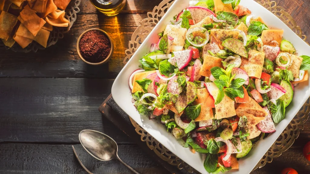 طبق الفتوش هو طبق شهير في المطبخ الشرق أوسطي، وهو يتكون بشكل أساسي من الخضروات المفرومة والفريشة، والخبز المحمص. إليك طريقة تحضير طبق الفتوش: