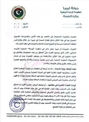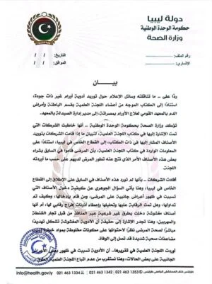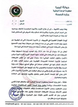 وزارة الصحة أكدت في بيان لها أنها خاطبت الشركات التي تمت الإشارة إليها في كتاب اللجنة العلمية، لتبيان ما إذا قامت الشركات بتوريد الأصناف المشار إليها في ذات الكتاب، إلى القطاع الخاص في ليبيا، استنادًا على المعلومات الواردة في كتاب اللجنة العلمية، بأن المرضى قاموا في السابق بشراء بعض هذه الأصناف الأمر الذي نتج عنه تطور المرض لديهم على حسب ما أوردته اللجنة.