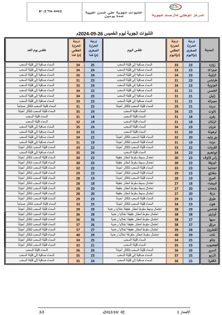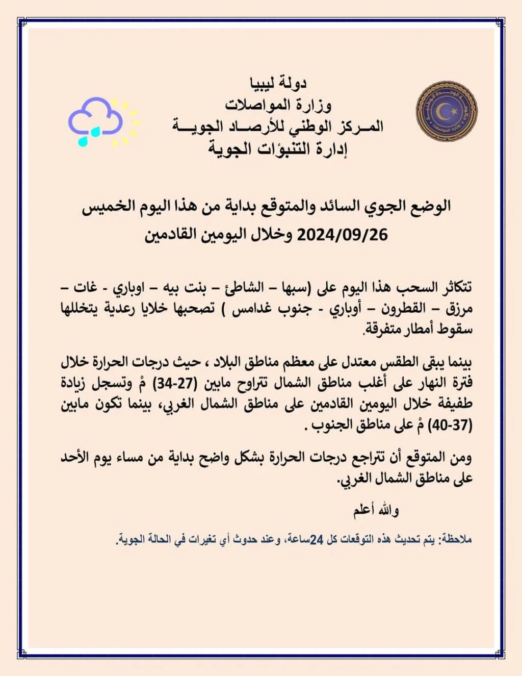 أفاد مركز الأرصاد الجوية بتكاثر السحب هذا اليوم على (سبها – الشاطئ – بنت بيه – اوباري – غات – مرزق – القطرون – أوباري – جنوب غدامس ) تصحبها خلايا رعدية يتخللها سقوط أمطار متفرقة.