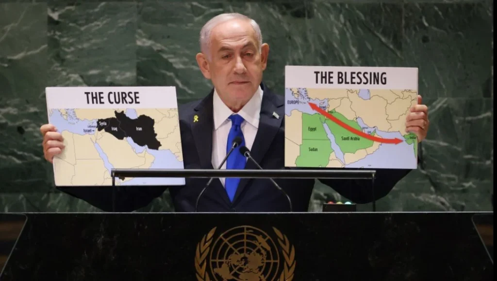 “خارطة اللعنة” و”خارطة النعمة” كانتا محل تركيز خطاب رئيس الوزراء الإسرائيلي، بنيامين نتانياهو، من منبر الأمم المتحدة، حيث طلب من العالم أن يختار بين بلاده التي “تدافع عن السلام والديمقراطية”، حسب تعبيره، وبين الدول الأخرى التي “تدعم الإرهاب” مثل إيران.