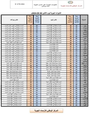 درجات الحرارة القصوى: تتراوح على أغلب المناطق ما بين 26-31مْ وتسجل ارتفاعا تدريجيا على أغلب المناطق من يوم الأربعاء.