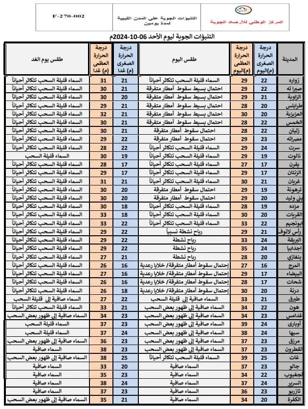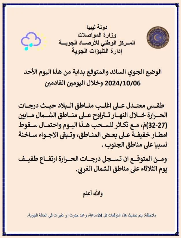 وأوضح المركز في نشرته الجوية اليوم الأحد، أن درجات الحرارة تسجل تراجعا بدايةً من اليوم مع تكاثر للسحب المصحوبة بخلايا رعدية مع سقوط أمطار متفرقة على المناطق الممتدة من ( المرج – الجبل الأخضر حتى درنة – بعض مناطق الدواخل ).