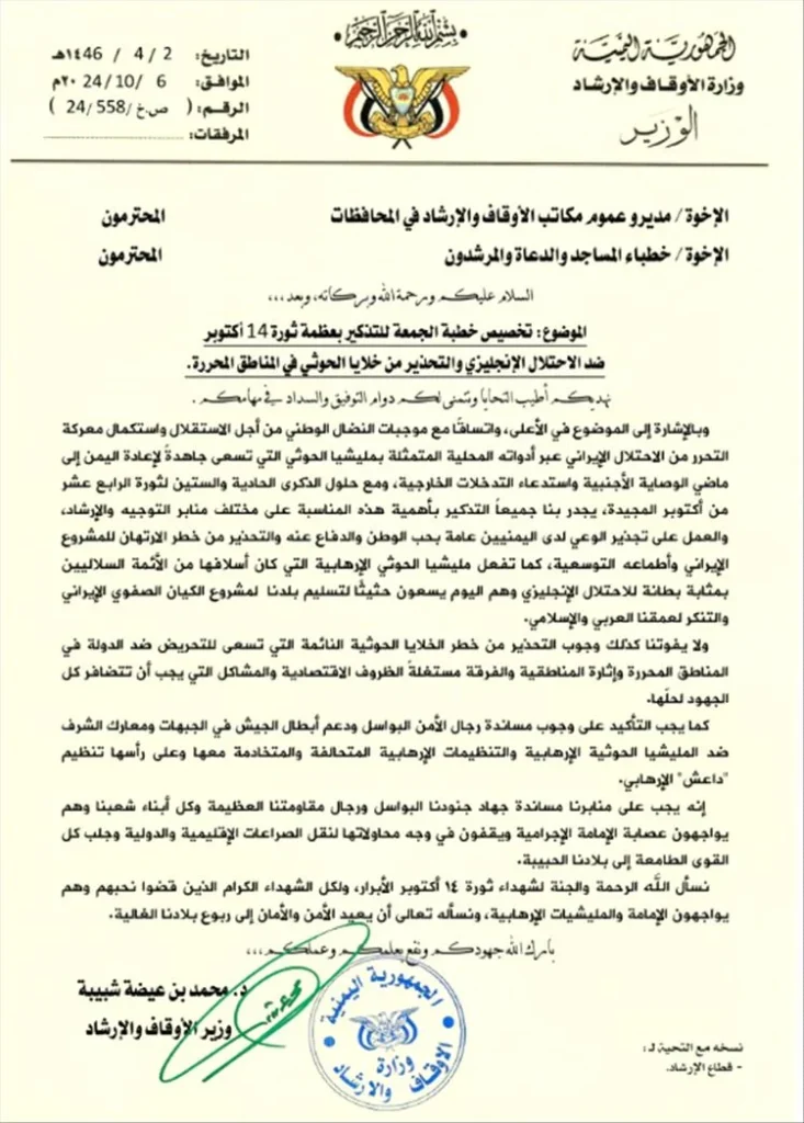 أصدرت وزارة الأوقاف والإرشاد اليمنية تعميمًا لتخصيص خطبة الجمعة القادمة للتذكير بعظمة ثورة 14 أكتوبر المجيدة ضد الاحتلال الإنجليزي،.