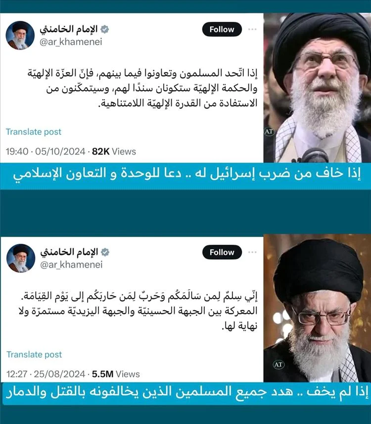 دعا الامام الايراني الامام الخميني المسلمين الى وحدة صف ضد اسرائيل وذلك بعد اقل من اسبوعين على تغريدة اثارت جدلا واسعا دعا فيها الى استمرار المعارك ضد