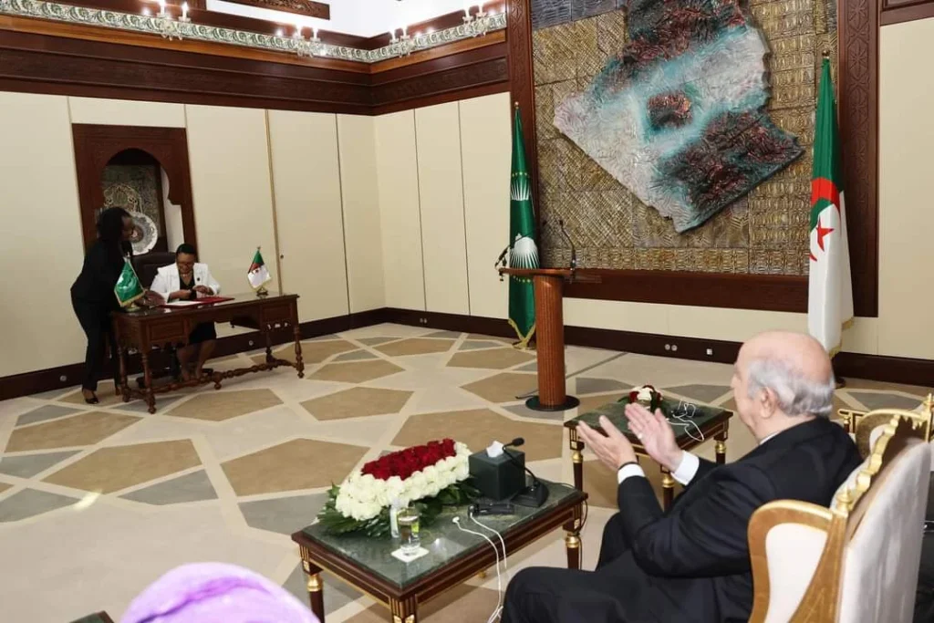 استقبل رئيس الجمهورية عبد المجيد تبون يستقبل السفيرة ماري أنطوانيت روز-كاتر، المديرة التنفيذية للأمانة القارية للآلية الإفريقية (MAEP)، عقب أدائها اليمين، أمام رئيس الجمهورية بصفته رئيسا لمنتدى دول وحكومات الآلية الإفريقية للتقييم من قِبل النظراء.