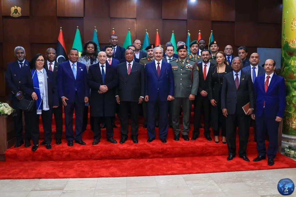 استقبل رئيس مجلس النواب عقيلة صالح رفقة رئيس الحكومة أسامة حماد والمشير خليفة حفتر، بمدينة بنغازي، رئيس جمهورية الكونغو برازافيل ديني ساسو نغيسو.