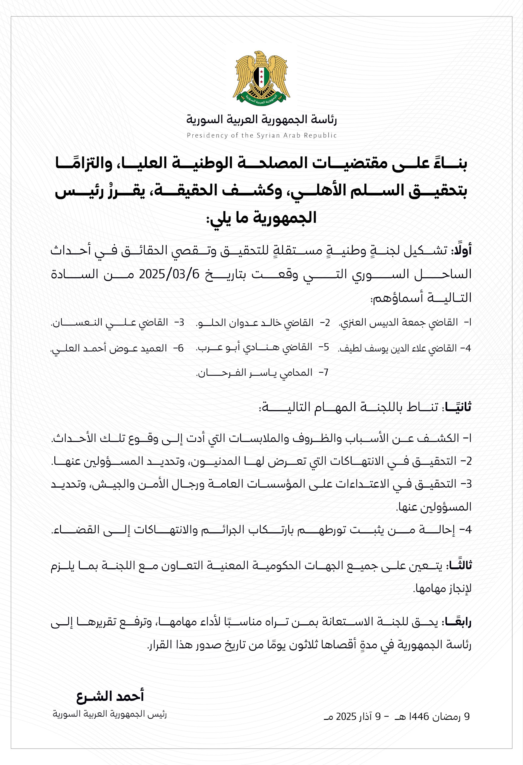 وذكرت الرئاسة السورية أن “اللجنة الوطنية المستقلة للتحقيق وتقصي الحقائق في أحداث الساحل السوري” سترفع تقريرها في مدة أقصاها ثلاثون يوما من تاريخ صدور القرار.
