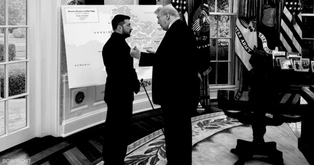 عرض الرئيس الأميركي دونالد ترامب على نظيره الأوكراني فولوديمير زيلينسكي في اجتماع بالمكتب البيضاوي خريطة واسعة تظهر الأراضي التي استولت عليها روسيا في أوكرانيا. أُجري نقاش مطول قبل الاجتماع مع قادة أوروبا حول تفاصيل الخريطة التي أطلقت عليها صحيفة “كييف بوست” اسم “الخريطة الصراع الروسي الأوكراني”.