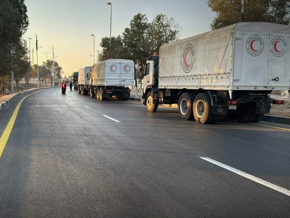 وتتضمن القافلة مواد غذائية ومحروقات وأطنان من الطحين لتأمين احتياجات السكان المتضررين.