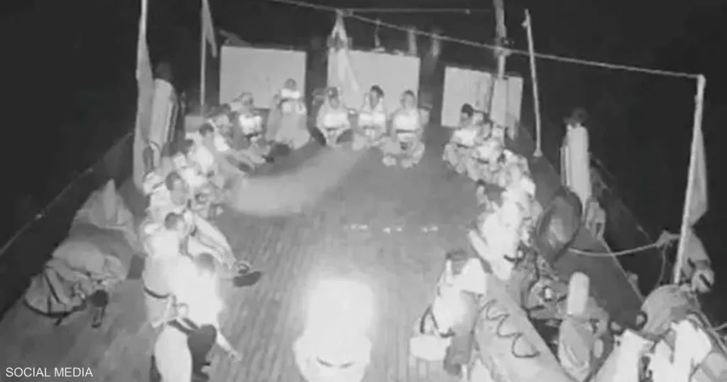 أظهرت لقطات من كاميرات بث حي من القوارب وتحققت منها رويترز جنوداً إسرائيليين يرتدون خوذات ونظارات رؤية ليليّة وهم يصعدون على متن القوارب التي تجمع مستقليها معا وهم يرتدون سترات النجاة وأيديهم مرفوعة.