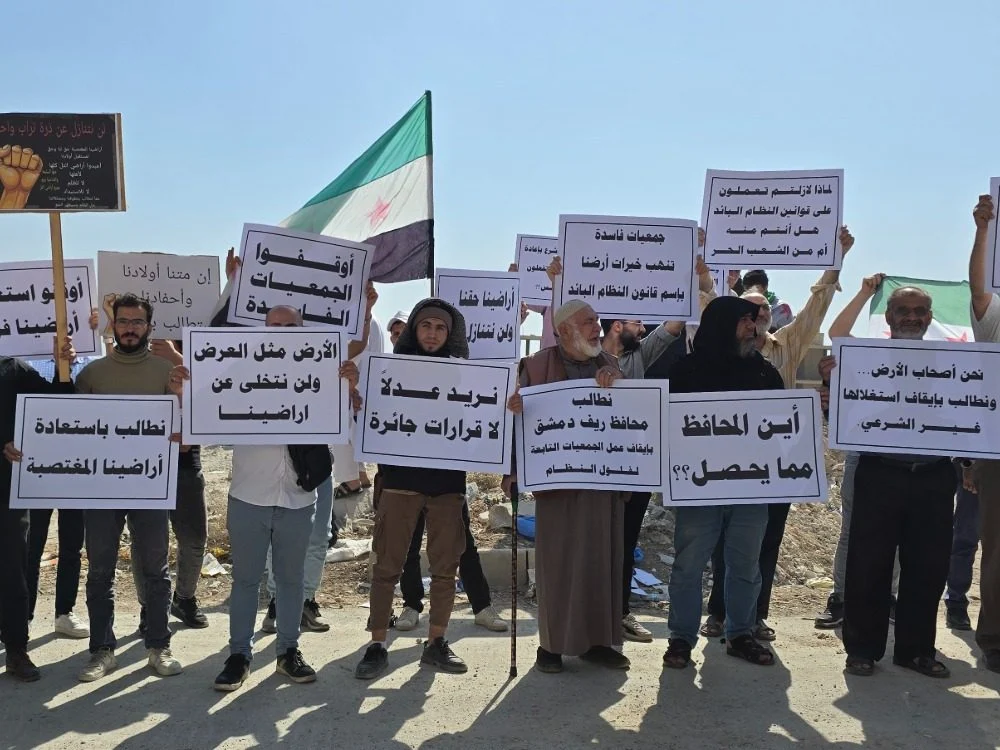 خرج أهالي مدينة التل في ريف دمشق اليوم 26 تشرين الأول في وقفة احتجاجية في ضاحية الشام للمطالبة بإعادة الأراضي التي استُملكها النظام البائد سابقاً.