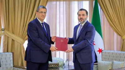 تسلم وزير الخارجية والمغتربين، أسعد الشيباني، نسخة من أوراق اعتماد سفيري لبنان والإمارات العربية المتحدة، وذلك خلال استقبالين منفصلين في مقر الوزارة بدمشق.