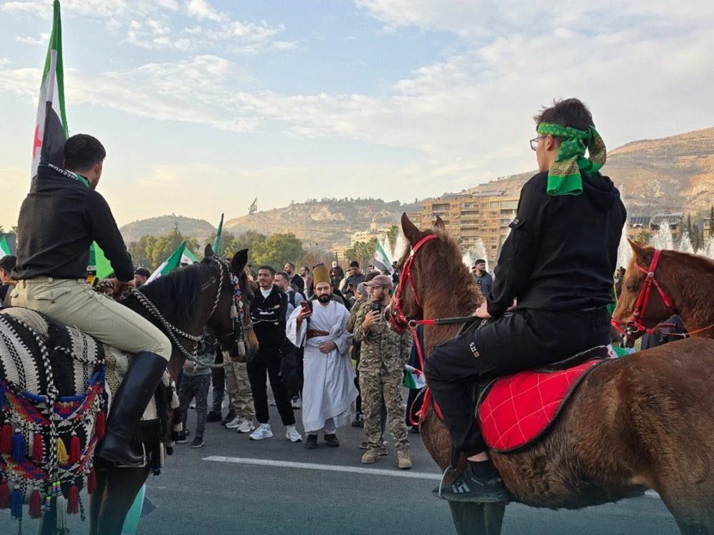 وتوافدت حشود كبيرة إلى ساحة الأمويين في دمشق منذ ساعات الصباح، بالتزامن مع مظاهر احتفالية في حي الميدان حيث رفع الأهالي شعارات تدعم الاستقرار وتؤكد رفض مشاريع التقسيم.