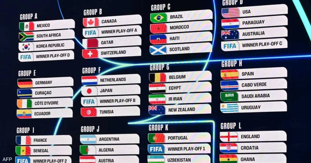وتخوض قطر، التي استضافت نسخة 2022، منافسات المجموعة الثانية أمام كندا وسويسرا والفائز من مسار الملحق الأوروبي الذي يجمع إيطاليا وإيرلندا الشمالية وويلز والبوسنة والهرسك.