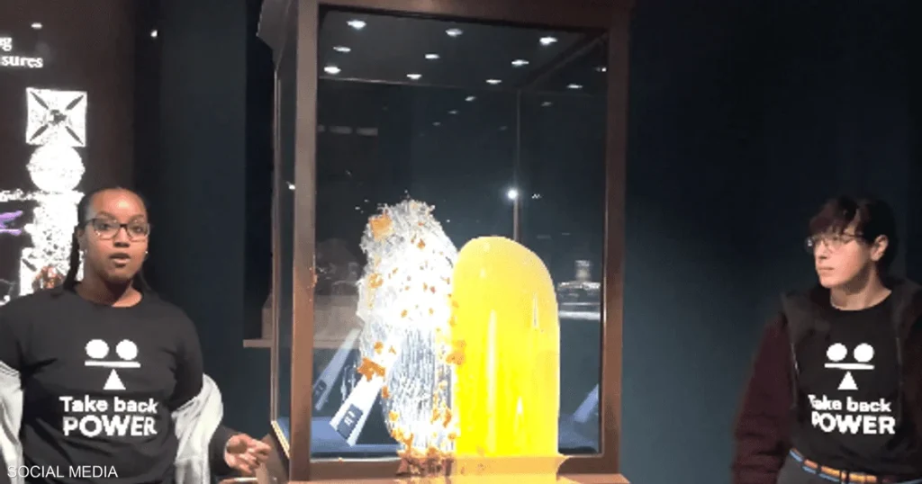 اعتقلت الشرطة البريطانية أربعة محتجين من مجموعة «استعادة السلطة» بعدما قاموا بتلطيخ حاوية عرض مجوهرات التاج الملكي داخل برج لندن بحلوى كرامبل التفاح وكريمة الكاسترد.