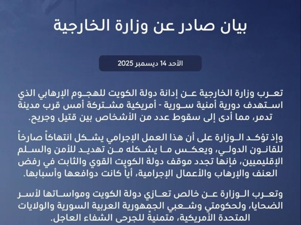 أدانت وزارة الخارجية في دولة الكويت الهجوم الإرهابي الذي استهدف دورية أمنية سورية – أميركية مشتركة قرب مدينة تدمر أمس. وأكدت الوزارة أن هذا العمل الإجرامي يشكل انتهاكاً صارخاً للقانون الدولي، ويعكس تهديداً للأمن والسلم الإقليميين. وجددت الكويت موقفها الراسخ في رفض العنف والإرهاب والأعمال الإجرامية، أياً كانت دوافعها وأهدافها. وأعربت الوزارة عن خالص تعازيها ومواساتها لأسر الضحايا ولحكومتَي وشعبي الجمهورية العربية السورية والولايات المتحدة الأمريكية، وتمنت الشفاء العاجل للجرحى.