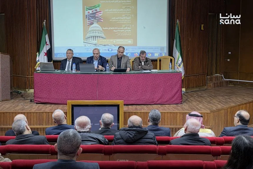 وأكد الخالد أن الندوة تهدف إلى توضيح الأبعاد القانونية والسياسية والاقتصادية للقانون، وشرح دلالات إلغائه وانعكاساته على المرحلة الانتقالية في سوريا، بما يسهم في تعزيز الوعي القانوني ودعم النقاش الأكاديمي المسؤول وتحفيز الطلبة على الحوار والمشاركة.