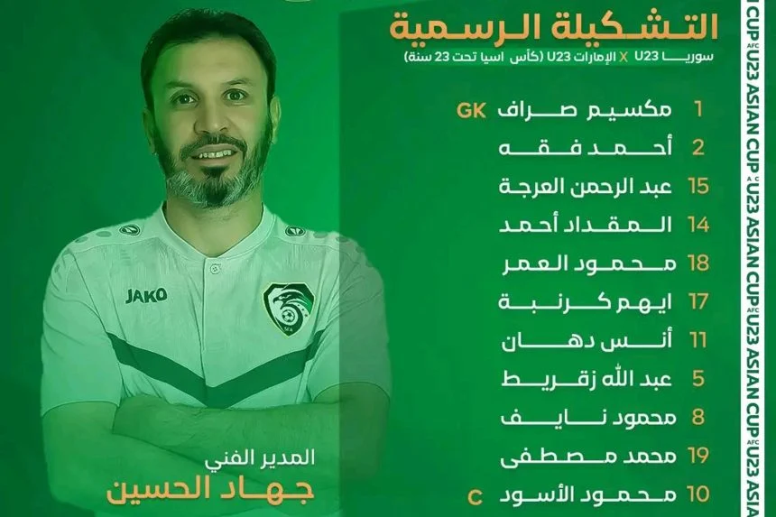 أعلن المدير الفني للمنتخب السوري الأولمبي لكرة القدم عن التشكيلة التي سيخوض بها مباراته مع نظيره الإماراتي في الجولة الثالثة من كأس آسيا تحت 23 عاماً، المقامة منافساتها في السعودية.