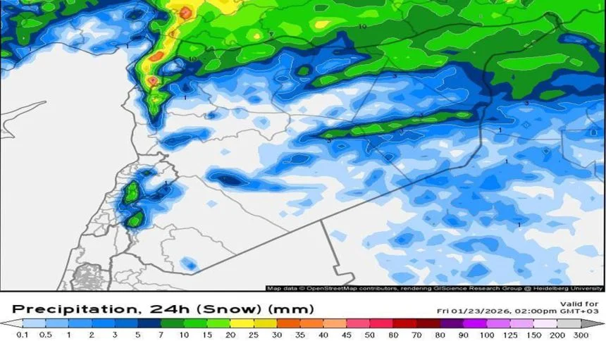 وذكر أن التراكمات قد تتجاوز 15 سم في منطقة جسر الشغور وريفها الغربي، إضافة إلى المرتفعات الساحلية التي تزيد على 800 متر.